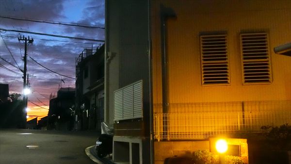 黎明の住宅地では、住宅の門灯が色温度の低い暖色系の光、それに街灯は色温度の高い青みがかった白色、そして東の空の端は朝焼けの二千数百Kのひじょうに色温度が低く、上空はひじょうに色温度の高い青・・・、朝の住宅地には彩り豊かな光が交差していました。
