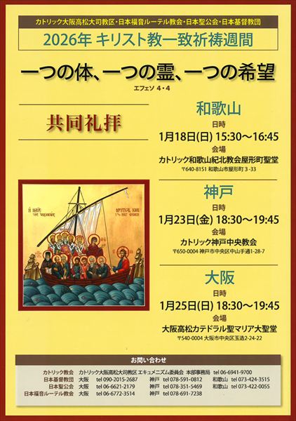 エキュメニカルな教会では、1月18日から25日までが「2026年度キリスト教一致祈祷週間」として、「一つの体、一つの霊。一つの希望」をテーマとして、関西では日本基督教団、日本聖公会、日本福音ルーテル教会、そしてカトリック大阪高松大司教区が共同で”共同礼拝”を持ち、神戸では、カトリック神戸中央教会で1月23日に持たれました。