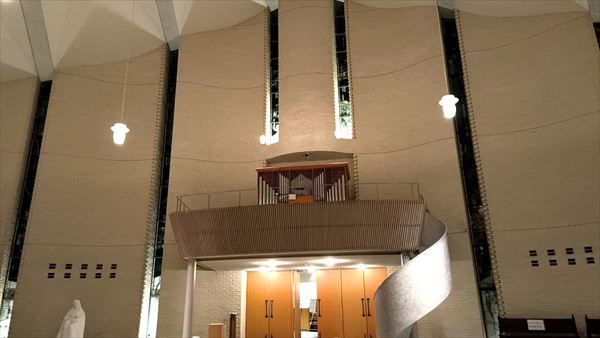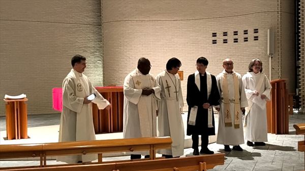 カトリックのミサのスタイルで進められるようで、入道の歌のパイプオルガンの前奏がはじまると会衆は起立して賛美する中で5人の神父・司祭・牧師と1人の執事が入場しました。プロテスタントの教会では、このような聖職者入場のスタイルを経験したことがないです。
