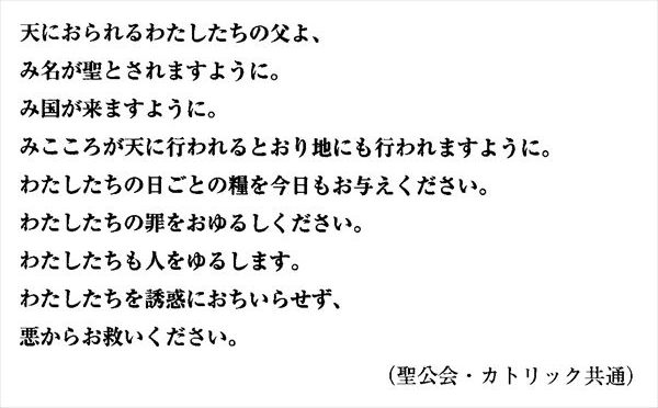 これは2000年にカトリック教会と日本聖公会とが共通口語訳として制定したもので、最後の「国と力と栄光は、永遠にあなたのものです。」はラテン語訳文にないのでカトリック教会では伝統的に「主の祈り」と見なさなれていないです。