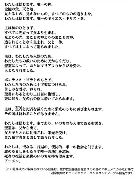 いわゆる使徒信条は、これまでプロテスタントの教会の礼拝では、日本基督教団が1954年に制定した文語調の信仰告白文で、1954年版讃美歌566番として掲載されるものが多いですが、福音派の中には「生ける者と死ねる者とを審きたまはん。」が「生ける者と死にたる者とを審きたまはん。」となっています。この訳文を遡れば、大元は日本基督教会(旧日基)が1890年(明治23年)に制定した日本基督教会の信仰告白になるようです。現在では讃美歌21に掲載されている口語文の信仰告白もあるようですが、まだ経験したことはないです。