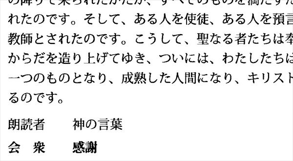 礼拝プログラムにも書かれていますが、聖書朗読の後に朗読者が「神の言葉」と付け加え、それに対して会衆一同が「感謝」と応答するスタイルは新鮮でした。幾つかの聖書個所からの朗読がありましたが、その都度に朗読者が「神の言葉」、会衆一同が「感謝」とありました。