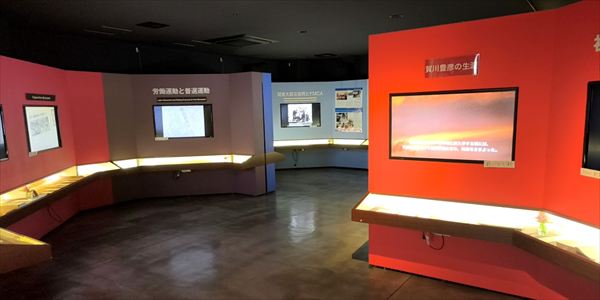 ミュージアムでは資料の展示と、ディスプレー画面による短い動画と、スライドショーの表示で、賀川豊彦の生涯、新川スラムでの救済活動、生活協同組合の活動、労働運動、農民運動、関東大震災の復興活動、そして平和・人権活動などの紹介をしていました。