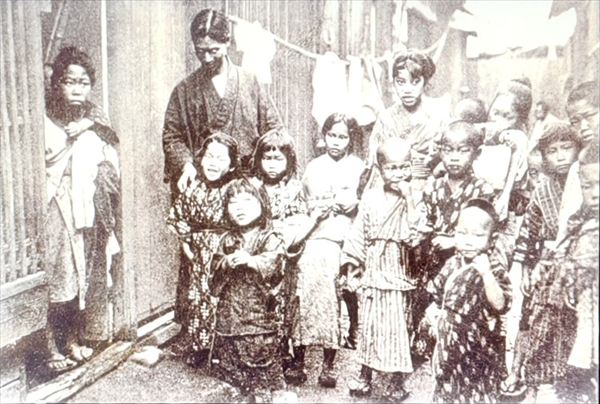 スラム街の子どもたちと共に写る賀川豊彦、学校に通っている子どもたちは少なく、子守をしている少女の姿もあります。