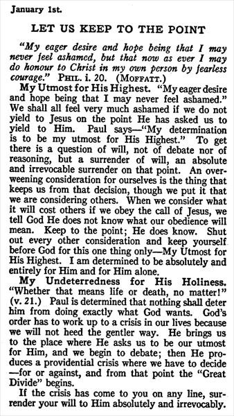 January 1st.”LET US KEEP TO THE POINT”,Oswald Chambers,My Utmost for His Highest