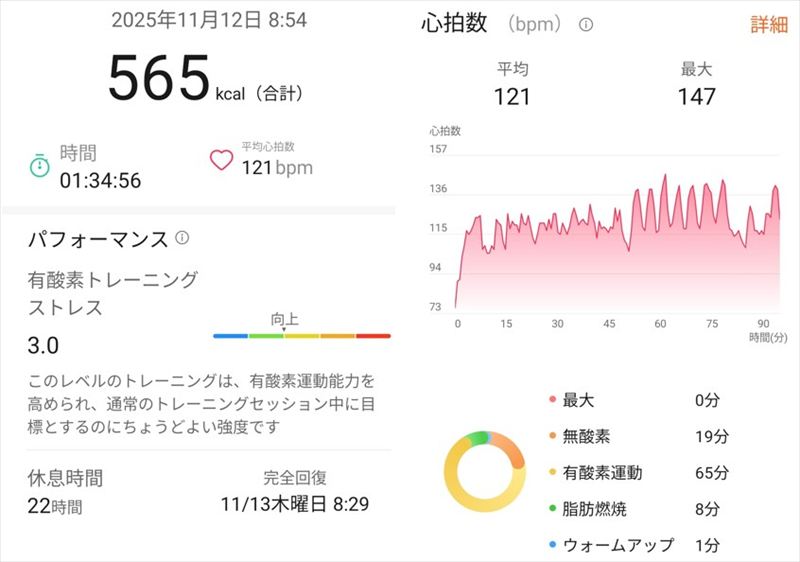 今日の午前はジムで1時間34分のトレーニングで、運動消費カロリーが565kcalで、平均心拍数が121bpmでした。ランニングマシンは30分で、ジョギングと競歩のインターバルでした。昨日が高負荷で長目のトレーニングだったので、今日は無理しないように少し控え目の筋トレでした。