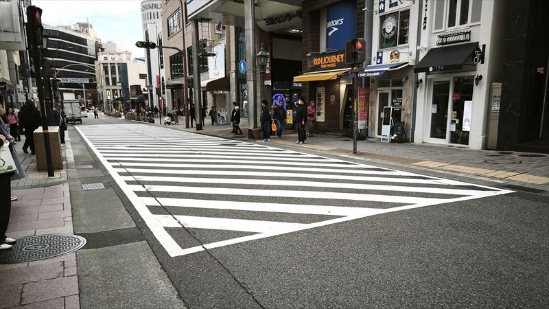 帰路は急がないので三ノ宮の町から元町の町まで歩きました。途中のトアロードで、道幅に比べて、横の長さが異様に長い横断歩道があって、いつもレンズを向けてしまいます。