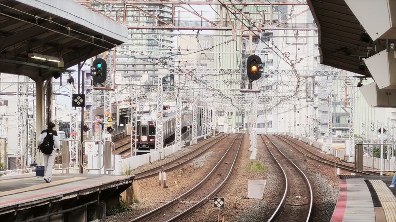 JR元町駅のホームの東端、東隣が三ノ宮駅で、阪急三宮駅は見えています。JRの複々線と阪急電車の複線が高架で並行する区間で、阪急電車は地下の神戸高速鉄道とつながっているので、、この部分で「高架から地下」へ至ります。