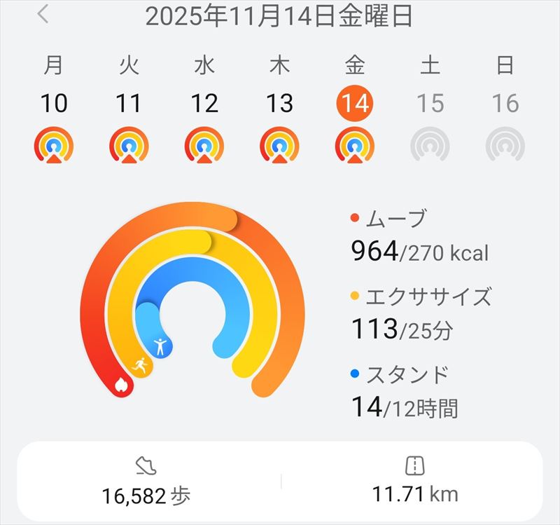 夕食後の、今日一日の消費カロリーは964kcalでした。火・水・木と3日続けて1000kcalを越えたのですが、今日は一歩及ばずでした。ただ月曜から5日続けて900kcalは超えました。