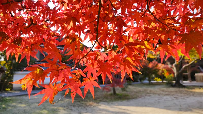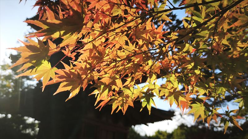 境内のカエデが紅葉で、秋の陽射しを受けて輝いて、見事でした。