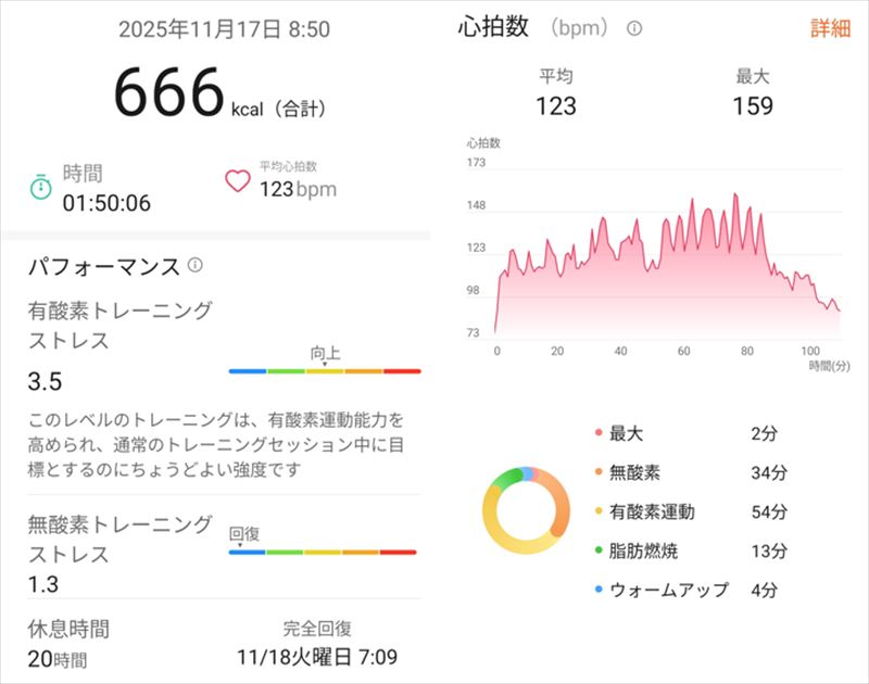 今朝のジム、トレーニング後に、すぐにスマートウォッチをOFFにし忘れてしまって、実際のトレーニング時間は1時間30分ぐらいです。ですので、平均心拍数も123bpmよりも高くなります。ランニングマシンで30分あまりのジョギングとインターバルが最後で、その後はロッカールームでの着替えとロビーでの休憩ですので、実際の平均心拍数は120bpm台後半かもしれません。運動消費カロリーが666kcalで、平均的なトレーニングでした。