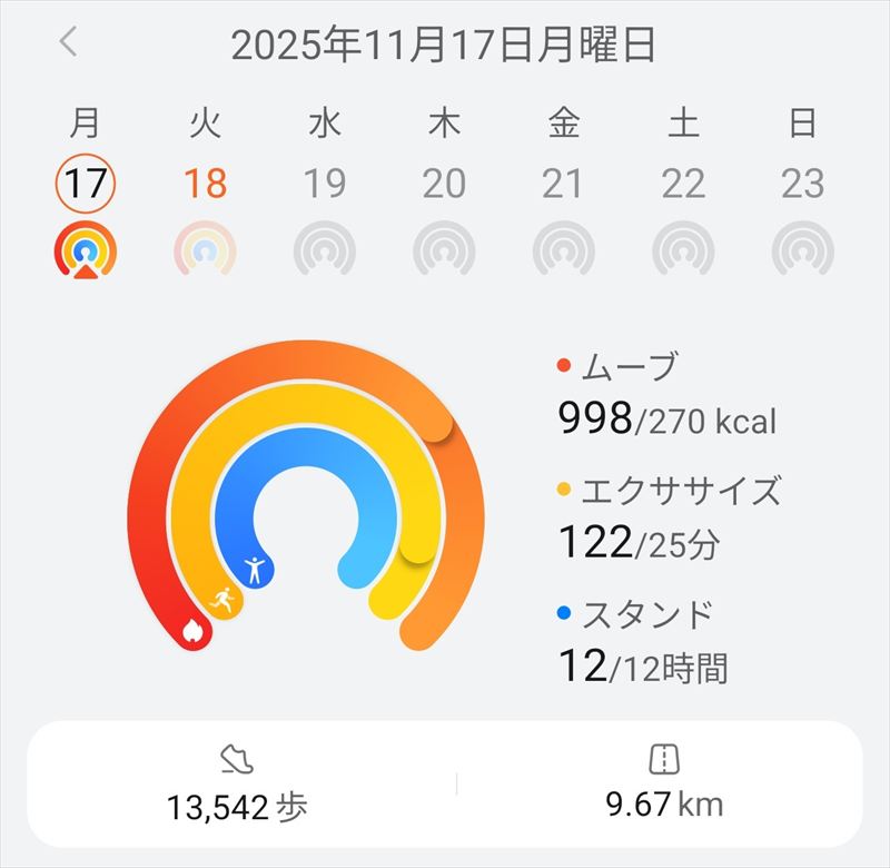 今日の夕食後までの1日トータルの運動消費カロリーが998kclで、1000kcalに一歩及ばずでした。エクササイズタイムが122分(2時間2分)で、歩数が13542歩でした。