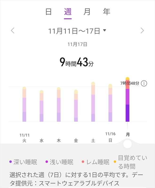 いつもは5時半の目覚ましを掛けて、早い時は5時過ぎに起床して目覚ましを止めて、遅い時でも目覚ましが鳴ってから少し布団の中にいるので、だいたい5時台前半から後半には起床しているのですが、今朝は目覚ましを止めてから、また寝入ってしまって目が覚めると7時前になっていました。土日と外出、先週はジムで汗を結構流したので、身体の疲れが溜まっていたのかもしれません。昨晩も睡魔に襲われて就寝時刻が速かったので、9時間43分も寝ていました。この1週間の平均睡眠時間は7時間48分でした。