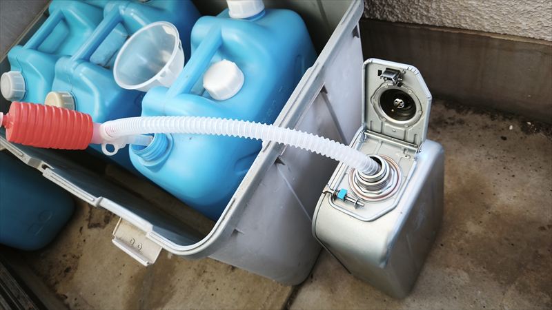 自宅の2階のべランドの隅に灯油のストッカーを置いて、ポリ容器3つが入ります。年末や真冬には3つとも灯油をストックしますが、とりあえず1つだけ給油して、2階の石油ストーブに入れました。