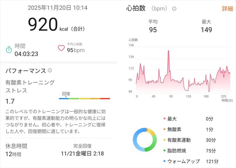 岩盤浴と入浴とで4時間3分、消費カロリーが920kcalにもなりました。平均心拍数が95bpmで、心肺機能や筋肉をそれほど使わず、おもに脂肪消費による代謝になるのかもしれません。心拍数のグラフを見ると1分間ぐらい心拍数が飛び抜けるように高くなっていますが、これは岩盤浴で寝ていて、急に立って移動した時かもしれません。それ以外では心拍数が120bpm台ぐらいになることが何度かありますが、それ以外は岩盤浴で寝ているので90bpm程度ですので、心肺機能の負荷は低いようです。