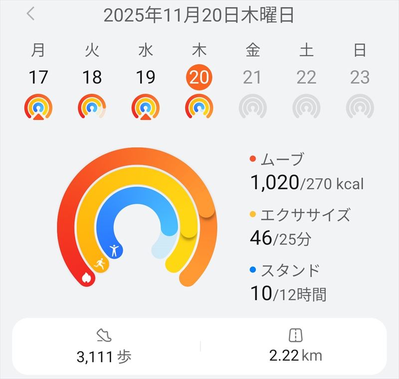 夕食前までの今日の消費カロリーは1020kcalでした。車で往復して歩数も3111歩なので、ほとんどは岩盤浴と入浴における脂肪燃焼だと思います。エクササイズが46分で、当然身体をあまり動かしていないので、今日は筋肉の休日でした。