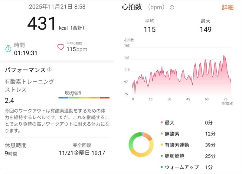 今朝のジム、疲労があるのか、なんとな身体が怠く、1時間余りでトレーニングをやめてしまいました。ただ負荷を大きくしているのですが、心拍数がそれほど上がらず、またランニングマシンで、ジョギングと競歩のインターバルでも、なんとなく疲労感を感じながらも心拍数は140bpm程度までしか上がらず、競歩では120bpm以下までスムーズに下がるので、心肺機能の過渡応答は良く、心拍数のメリハリも良いので、身体の疲労ではなくて、気持的に疲れていただけかもしれません。後になって、もっとトレーニングを続けていれば良かったと後悔しました。