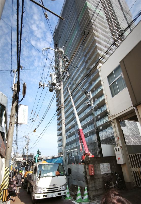 垂水駅前の再開発のメインであるタワマンのプラウドタワー神戸垂水の建設が進んでいます。完成すれば32階建てなのですが、まだ高くなるようです。タワマンの西側の道路での工事が始まって、車両通行止めになっていました。元々は垂水廉売市場や垂水センター街の一部の場所で、建設地の東側がレバンテ1号館、2号館、3号館の新しい街並みに区役所と図書館、バスターミナルが出来ています。西側は、この狭い道を挟んで、そのままなので、この道もそのままのようです。