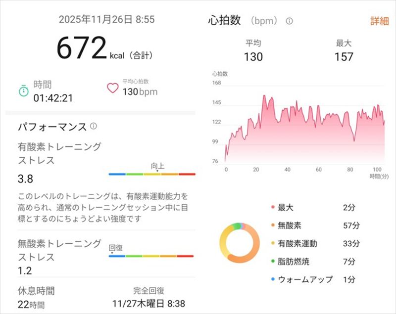 先週末から3連休を挟んで5日ぶりのジムでのトレーニング、最初は負荷を小さくして、その後、いつもの負荷を掛けて、体幹と上半身を中心に筋トレのマシンを使い、後半はランニングマシンで、ジョギングと競歩のインターバルのつもりが、ジョギングをしていると右膝が痛いような気がしたので、無理せず競歩での20分、その後は筋トレマシンを使って、1時間42分のトレーニングで運動消費カロリーが672kcal、平均心拍数が130bpmでした。3連休は、それほどトレーニングをしていなかったので、心拍数が上がり気味のような感じです。