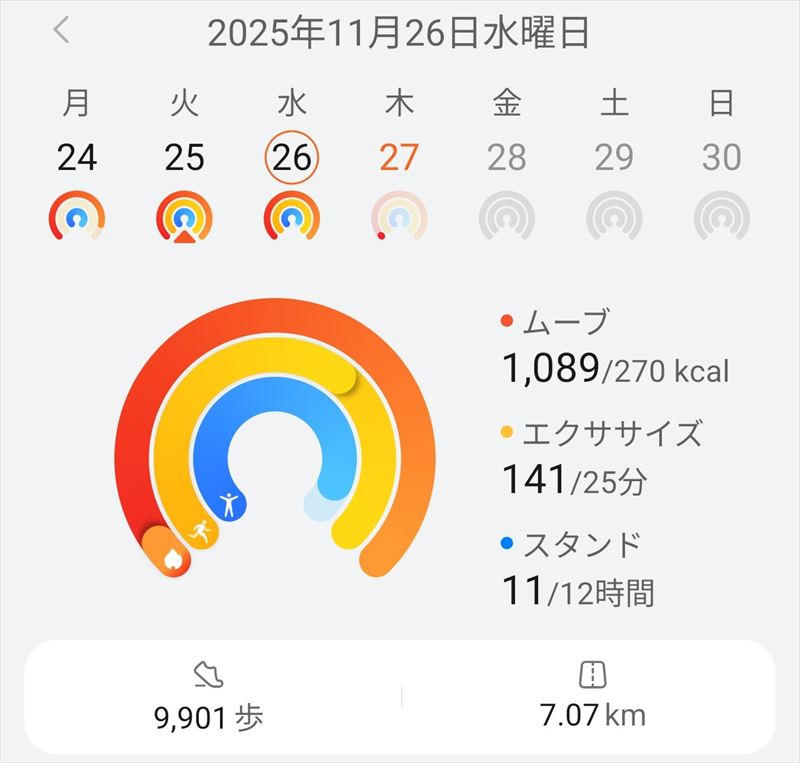 就寝前までの1日の運動消費カロリーが1089kcal、エクササイズタイムが141分(2時間21分)で歩数が9901歩でした。