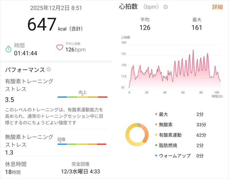 今日のジムでは、いつも通りのメニューで上半身と体幹を中心に筋トレマシンを使い、そしてランニングマシンではジョギングと競歩とのインターバルで40分程度汗を流しました。1時間41分のトレーニングで運動消費カロリーが647kcal、平均心拍数が126bpmでした。有酸素トレーニングストレスが3.5で「向上」でした。