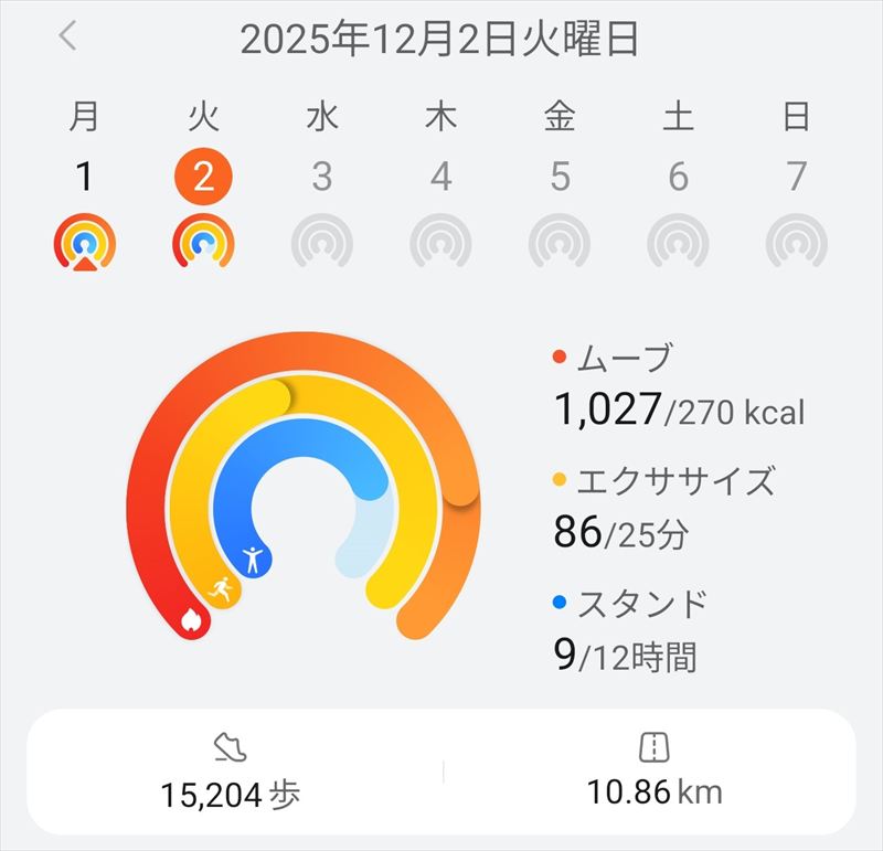 夕食前前までの今日一日の運動消費カロリーは1027kcalで、エクササイズタイムは86分(1時間26分)、そして歩数は15204歩でした。