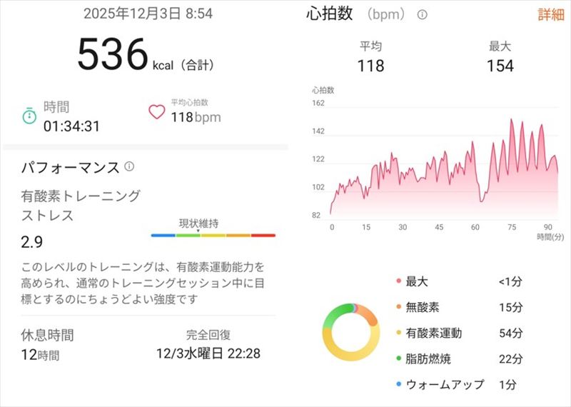 今朝のジムでは、1時間34分のトレーニングで、運動消費カロリーが536kcal、平均心拍数が118bpmでした。今週は3日連続で、筋トレ負荷はいつもより大きくして、1セットの回数も増やしたのですが、息がそれほど上がらず、心拍数もそれほど上がらなかったです。スマートウォッチの脈拍をもとに運動消費カロリーを算出しているので、物理的な運動量としては結構負荷が大きかったですが、スマートウォッチの算出値は、それほど大きくならなかったです。体力がついたのか?それとも単に身体が慣れただけかもしれません。
