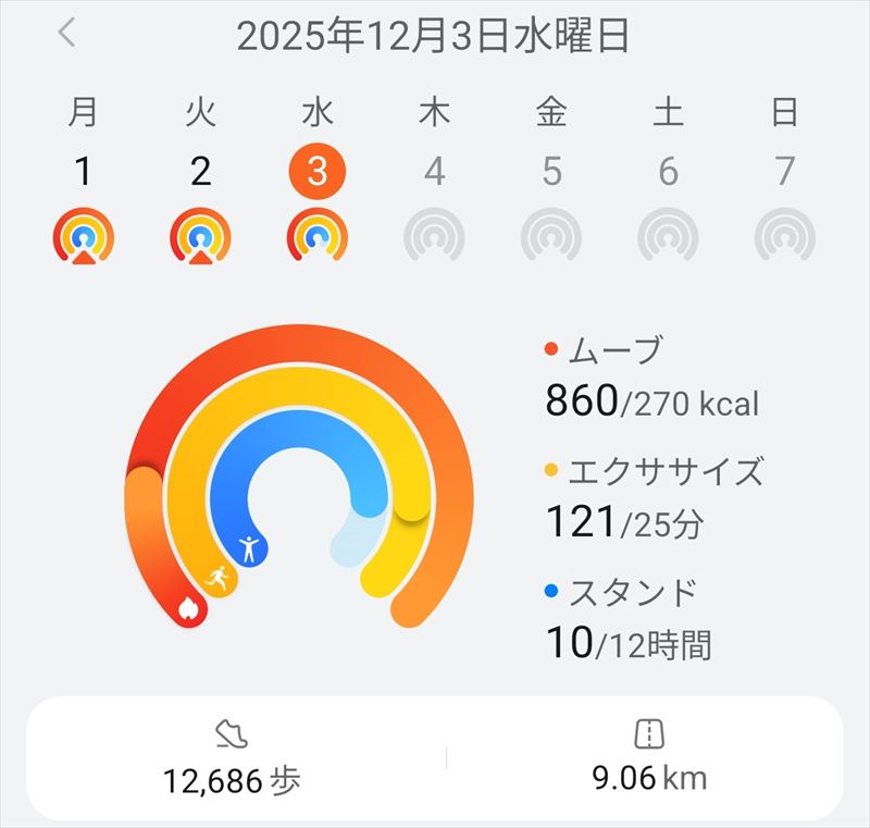 夕食前までの一日全体のカロリーは860kcal、エクササイズタイムが121分(2時間1分)、歩数が12686歩でした。