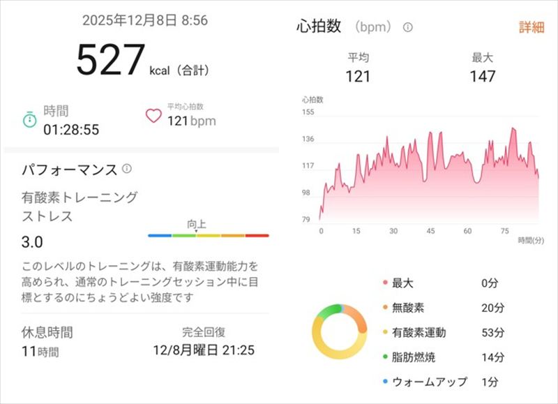 今日は1時間28分のトレーニングで、運動消費カロリーが527kcal、平均心拍数が121bpmでした。