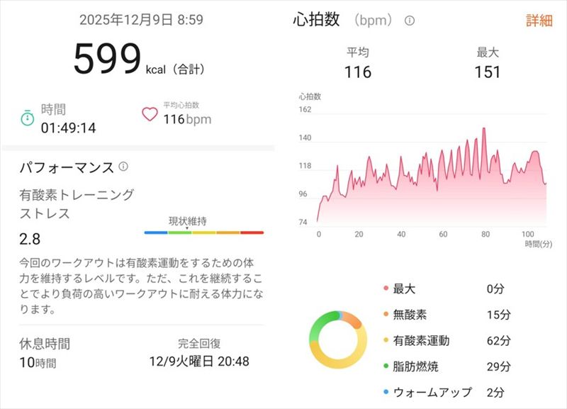 今日のジムでは、1時間49分のトレーニングで、運動消費カロリーが599kcal、平均心拍数が116bpmで、有酸素トレーニングストレスが2.8でした。いつもと同じ負荷の筋トレで、時間も1時間50分近いですが、昨日ピッとした右膝が気になって、ランニングマシンでは、ランニングと競歩のインターバルを20分程度にして、その後は、かなり速い競歩ばかりだったこともあるようです。筋肉が活性化して、同じ運動量でも心拍数が上がりにくくなって、トレーニングの成果が出たのであれば嬉しいですが、まだ何とも言えません。