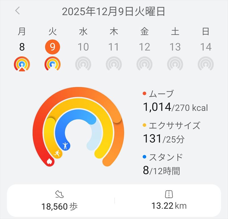 夕食前までの今日一日の運動量は、運動消費カロリーが1014kcal、エクササイズタイムが131分(2時間11分)、歩数が18,560歩でした。