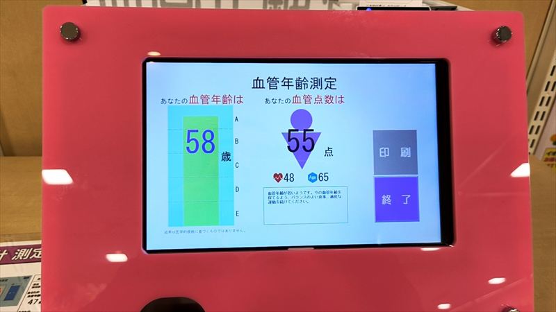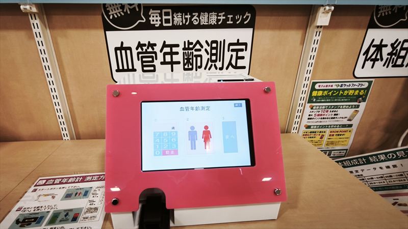 薬局でサプリを買ったのですが、薬局の奥に血管年齢測定器があるのに気づきませんでした、さっそく試してみました。
