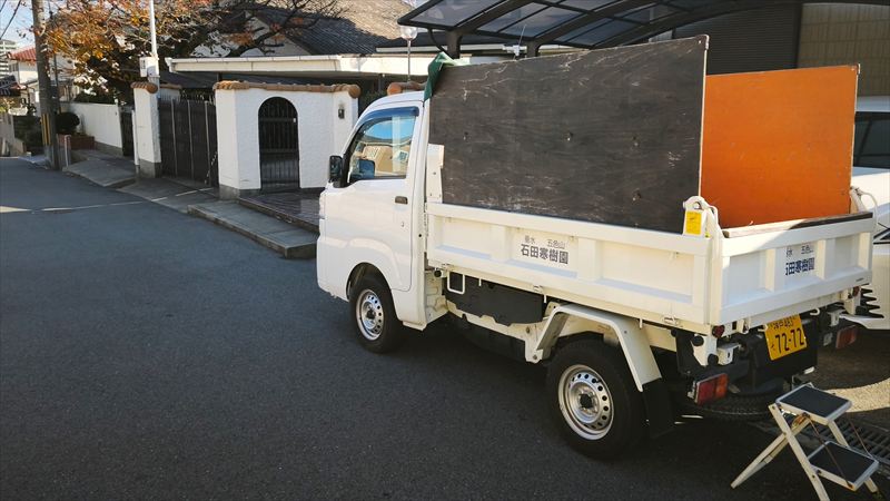 11月末頃には、住宅地の中の彼方此方で、植木屋さんが庭の手入れをしているのを見掛けましたが、久し振りに植木屋さんの軽トラを見掛けました。この家は北側に玄関があり、庭は家の南側なので、植木屋さんが庭の手入れをしている姿は見ることが出来ませんでした。