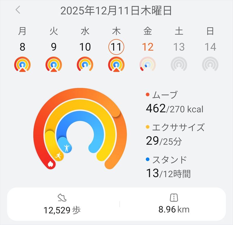 今日の就寝前までの1日の運動量は、運動消費カロリーが462kcal、エクササイズが29分、歩数が12,529歩でした。