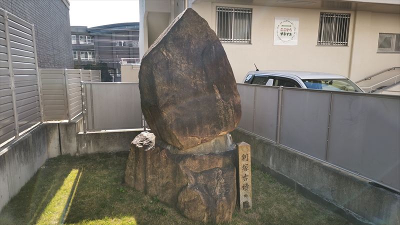 割塚古墳は、豊臣秀吉が大坂城を築くのに、古墳の石室の巨石を運び去り、残石だけが打ち捨てられたと言い伝えがあり、また阪急の高架の場所だったので移転した経緯がある不運な古墳跡です。元々は城内歩道橋の南端ぐらいにあったようです。