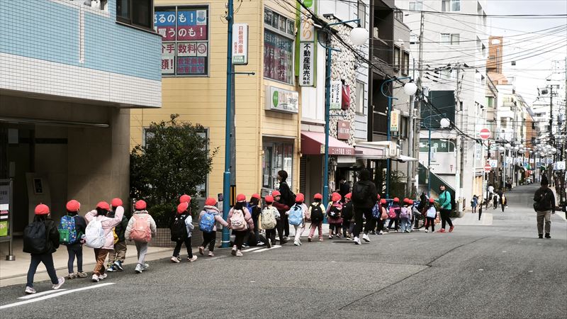 JR神戸線の灘駅から水道筋商店街へ向かう途中、幼稚園の子どもたちが列になって歩いていました。