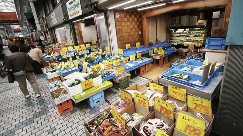 この八百屋さんは、3軒の隣り合う店を居抜きした新しい店のようで、箱やカゴがそのまま商品棚として並べていました。