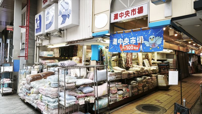 水道筋商店街の北側に枝分かれしたような灘中央市場、関西風の個人経営の小売りの店が長屋のように連なった商店の集合体です。中は・・・結構シャッターが閉まっていました。
