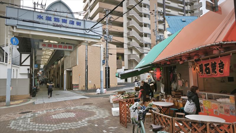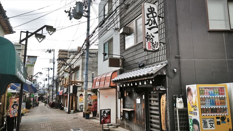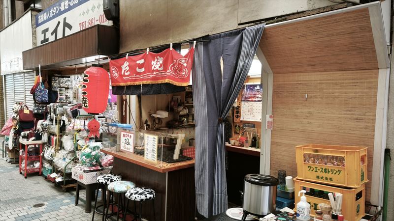 水道筋商店街の東側は、駅から遠くなって、人通りも疎らになります。たこ焼き屋さんとボタン・生地屋さんが隣り合って、その向こうはシャッターが閉まっていました。