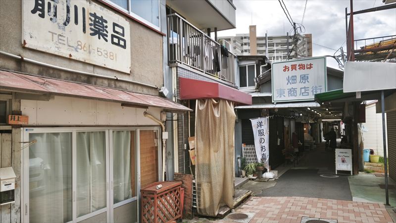 水道筋商店街と枝分かれする畑原商店街は、シャッターが閉まっている店いが多く、中も薄暗かったです。