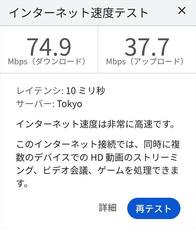 テザリングで自宅のネット環境は楽天モバイルなのですが、テザリング専用のスマホまではダウンロード74.9Mbps、ダウンロード37.7Mbpsです。早朝ならもっと早いと思います。今はスマホのテザリングを利用していますが、専用のWiFiルータにすれば、自宅のネット環境ももっと早くなるかもしれません。