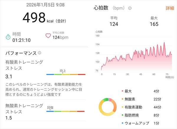 今朝は1時間21分のトレーニングで、運動消費カロリーが498kcal、平均心拍数が124bpmでした。最初の30分ぐらいは心拍数も低目ですが、後半の、特にランニングマシンでのジョギングと競歩のインターバルでは心拍数も上がって、全体的に心拍数が右肩上がりでした。