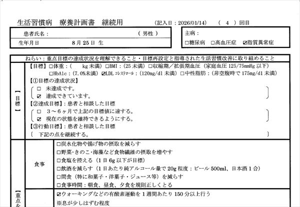 生活習慣病 療養計画書、4回目です。処方されて服薬治療中ですが、目標値は達成と言うことで、人間ドックで食事と運動のアドバイスを受けて以来、生活習慣の改善を3ヶ月近くして、年末年始も節制を心掛けていますが、あまり食事のコントロールが行き過ぎると、身体の疲労感が大きく、体重のダイエットも体脂肪計のデータでは、脂肪分だけではなくて筋肉の減少もあって、コントロールがむつかしいです。