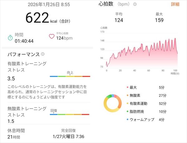 1時間40分のトレーニングで、運動消費カロリーは622kcal、平均心拍数が124bpmで、有酸素トレーニングストレスが3.5で「向上」でした。まだ余力があると思いますが、冬場は少し抑え目になってしまって、無酸素運動が有酸素運動の半分ぐらいです。