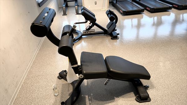 ジムのトレーニング室ですが、手前が腹筋台で、向こうが背筋台です。最近は体幹の脂肪減少と体幹の筋肉を鍛えるため、この2つのマシンは、他のマシンの合間に何度か使っています。