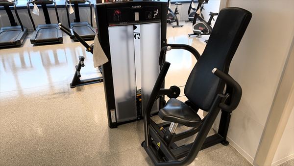 チェストプレスです。胸の筋肉を鍛えるマシンで、体幹と腕力に関係するので、このマシンでの筋トレにも重点を置いています。