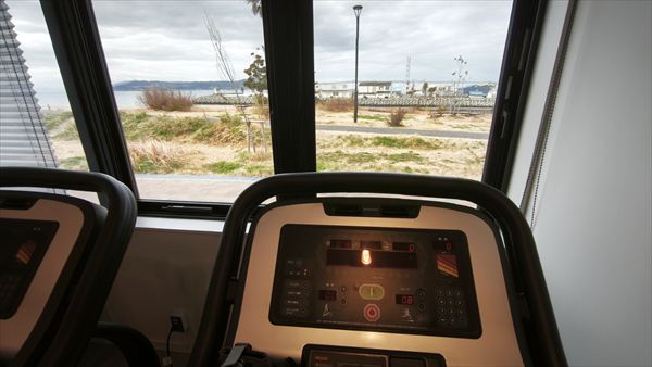 ランニングマシンで、ブラインドを上げると、真正面に明石海峡大橋の主塔が見え、淡路島の稜線も望むことが出来、今日はジョギングと競歩のインターバルで心肺機能のリハビリ、脚力、そして持久力と脂肪燃焼のために最後の40分をランニングマシンでのトレーニングに充てました。