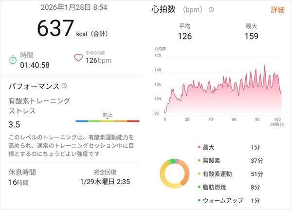 今日のジムでは1時間40分のトレーニングで、運動消費カロリーが637kcal、平均心拍数が126bpmでした。有酸素トレーニングストレスが3.5で、一昨日よりも無酸素運動と有酸素運動とも比率が小さくなりました。