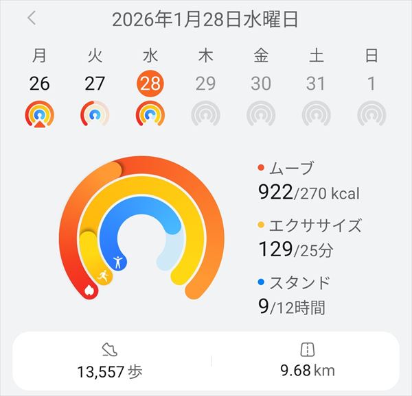 今日の夕方までの1日の運動カロリーは922kcal、エクササイズ時間が129分(2時間9分)で、歩数が13,557歩でした。寒さが厳しくなって、1日の運動カロリーが週に2回が3回は1000kcalを越えるが目標で、なんとかクリアしていたのが、半月ほど前から900kcalを越えても1000kcalを超えるのは稀になってしまいました。
