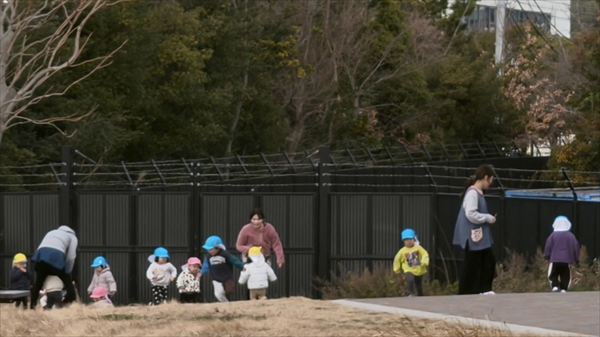 保育園児だと思うのですが、寒い中、保育士の方々が見守る中、寒空の下で元気に走り回っていました。